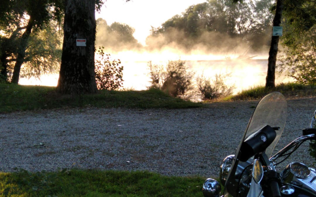 Vanuit de uitgang van onze tent hebben wij een zeer mooi zicht op een stuw, waar constant over de hele lengte een watermassa tuimelt. Bij aankomst weet de aardige terreinbeheerder te melden dat wegens werken de volgende ochtend vanaf 7 uur het water afgesloten is, waarschijnlijk.
