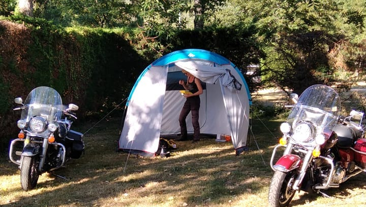 Een vriendelijke en grappige dame wijst ons met hese stem een keurig en schaduwrijk plekje aan, die we gretig aanvaarden. Na het installeren proberen we in de bar met een Desperado (Corona hebben ze niet) de hitte weg te spoelen. Tegelijk vernemen we dat op deze vooravond van de quatorze juillet de keuken enkel op reservatie Paëlla serveert. Gelukkig hebben wij nog wat in de koffertassen en rond half-tien gaan de ritsen dicht.