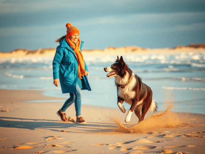 In de verte aan de vloedlijn houdt een man met hond halt. De bruin-beige Border Collie gaat netjes zitten. Zijn baasje kijkt om zich heen en bukt zich. Een zucht later voelt de hond zich bevrijd van de leiband en gaat rondjes trekken door het mulle zand. Zijn enthousiasme gooit pluimen in het rond. Zonder zichtbare aanleiding draait het beest plotseling pirouettes.