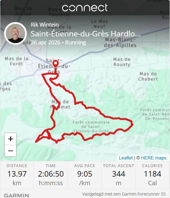 Naar goede Provençaalse gewoonte klinkt het startschot van de trail-run een dik kwartier te laat. Onmiddellijk brengt een vals plat de deelnemers een handvol meters hoger. Twee bochten later wacht hen een halve Paterberg. Iets verder – rond de eerste kilometer – duikt het parcours via een privéweg de natuur in en kan de piot Mijn Groote Liefde niet meer bijhouden. Het zal tot aan de laatste twee kilometer duren voordat de piot opnieuw asfalt onder de trailschoenen voelt. En zijn drill-instructeur terug ziet.